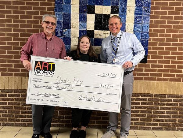 This photo features (from right to left): Matt Deaton (Principal, South Warren High School), Jada Roy (Grant Recipient and Art Teacher), and Paul Johnson (President, ArtWorks Inc.).