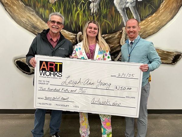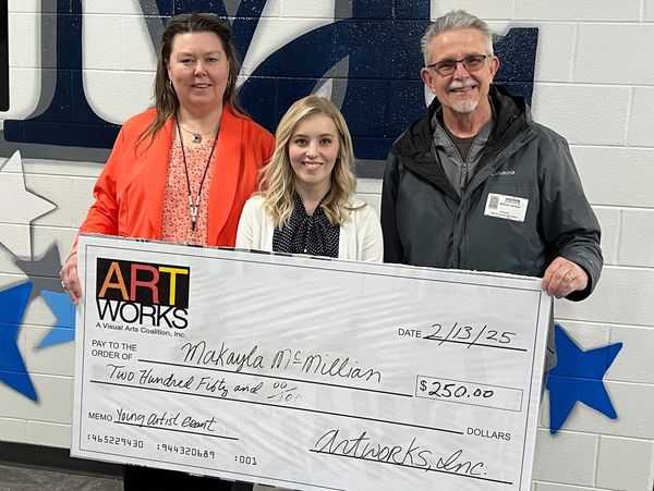 This photo features (from left to right): Melissa Emberton (Principle, Monroe County High School), Makayla McMillian (Grant Recipient and Art Teacher), and Paul Johnson (President, ArtWorks Inc.).